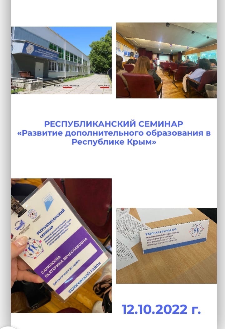 12.10.2022 г. РУКОВОДИТЕЛЬ МУНИЦИПАЛЬНОГО ОПОРНОГО ЦЕНТРА ДОПОЛНИТЕЛЬНОГО ОБРАЗОВАНИЯ БЕЛОГОРСКОГО РАЙОНА РЕСПУБЛИКИ КРЫМ Васильева Е.А. с директором МБОУ ДО «ЦДЮТ» БЕЛОГОРСКОГО РАЙОНА РЕСПУБЛИКИ КРЫМ Саркисовой Е.В. , приняли участие в Республиканском семинаре «Развитие дополнительного образования в Республике Крым в рамках реализации проекта «Успех каждого ребенка».Семинар проводился на базе ГБОУ ДО РК «Дворец детского и юношеского творчества»,